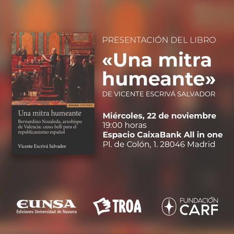 El próximo 22 de noviembre, la capital española será testigo de otra emocionante presentación de "Una mitra humeante. Bernardino Nozaleda, arzobispo de Valencia. Casus belli para el republicanismo español" de Vicente Escrivá Salvador. Este evento, que promete ser igualmente impactante, contará con la destacada asistencia del Nuncio de Filipinas en España, cuya participación ha sido confirmada, así como la posible presencia del embajador de Filipinas (aún por confirmar). Esta presentación se llevará a cabo en el Espacio Caixabank All in one, ubicado en la Pl. de Colón, 1, 28046, Madrid.