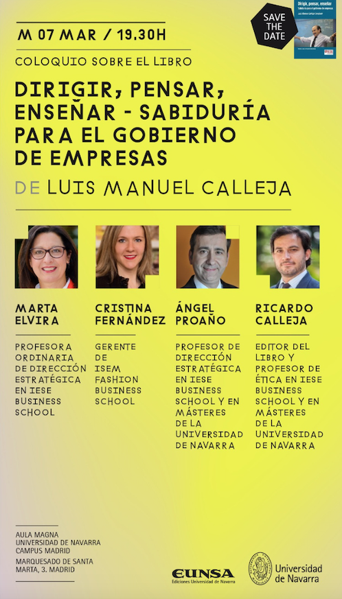 ¡Atención a todos los interesados en la gestión empresarial! Se llevará un coloquio el martes 7 de marzo a las 19:00 horas en la sede de posgrado de la Universidad de Navarra en Madrid. El evento girará en torno al libro «Dirigir, pensar, enseñar», editado por Ricardo Calleja Rovira, profesor del IESE, y escrito por Luis Manuel Calleja Corujedo, meses antes de su fallecimiento.