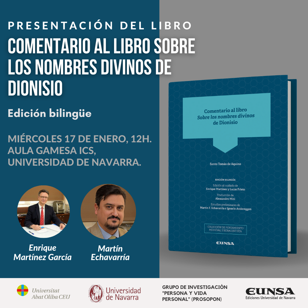 La Universidad de Navarra, acogerá el miércoles día 17 de enero a Enrique Martínez García, y Martín F. Echavarría, quienes presentarán el libro "Comentario al libro Sobre los nombres divinos de Dionisio. Edición bilingüe". Ambos han participado en la creación de este libro.