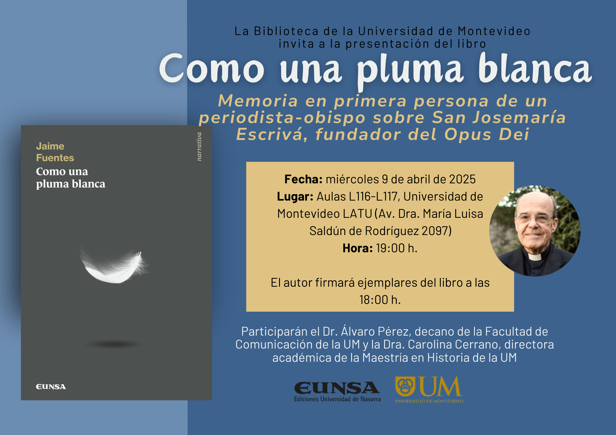 El miércoles 9 de abril a las 19:00 h. se llevará a cabo la presentación del libro Como una pluma blanca, escrito por Mons. Jaime Fuentes, obispo emérito de Minas, Uruguay. El acto tendrá lugar en la Universidad de Montevideo (sede LATU) y contará con la participación del prof. Dr. Álvaro Pérez, decano de la Facultad de Comunicación de la UM, y la prof. e historiadora Dra. Carolina Cerrano, directora académica de la maestría en Historia de la UM.