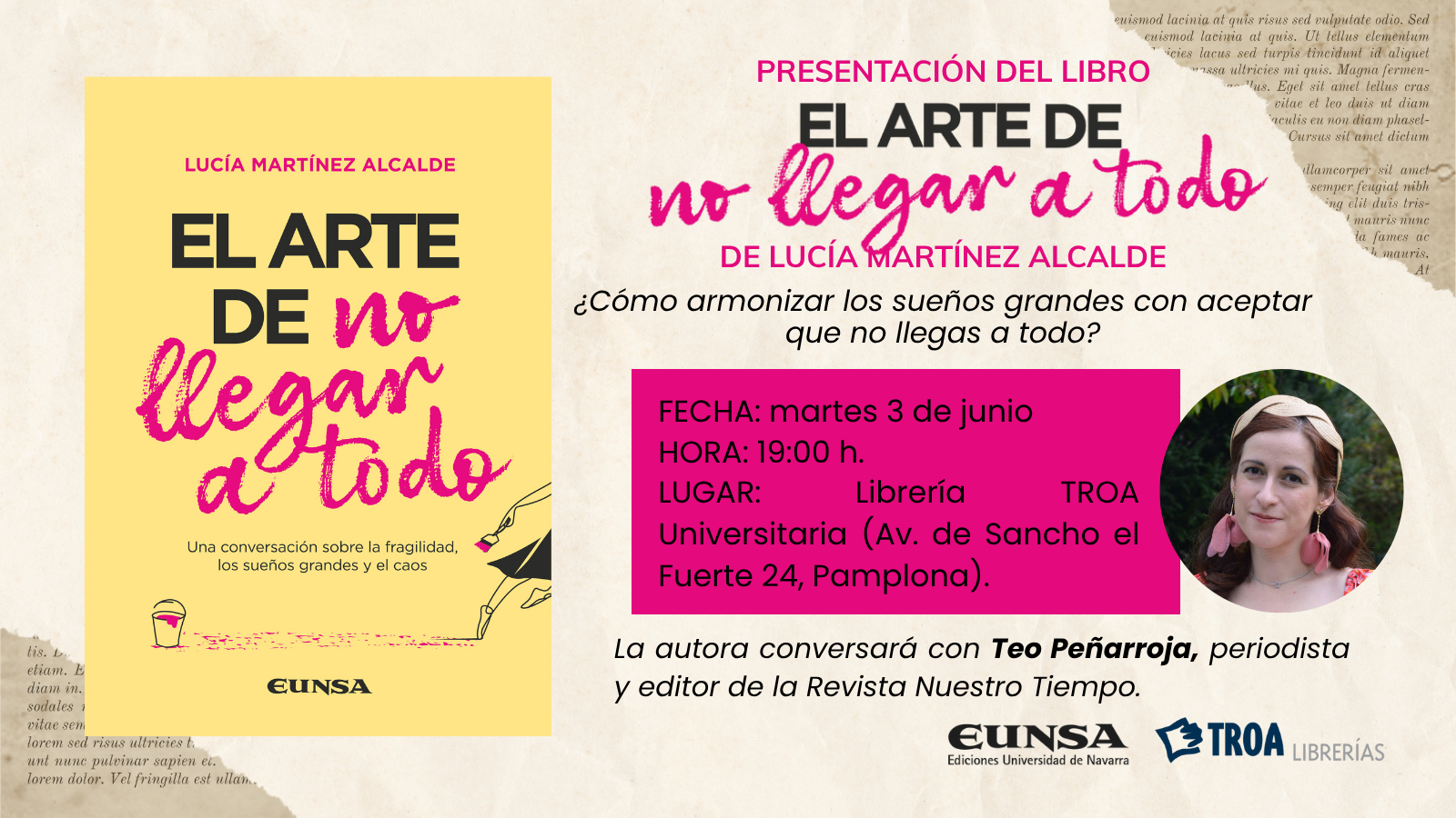 El próximo martes 3 de junio a las 19:00 h., en la Librería Troa Universitaria (Av. Sancho el Fuerte 24, Pamplona), presentamos el libro El arte de no llegar a todo. Una conversación sobre la fragilidad, los sueños grandes y el caos, de Lucía Martínez Alcalde, filósofa, periodista y madre de tres hijos.