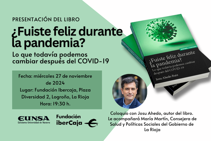 Nos complace invitarle a la presentación del libro ¿Fuiste feliz durante la pandemia? Lo que todavía podemos cambiar después del COVID-19, escrito por Josu Ahedo y publicado por Ediciones Universidad de Navarra (EUNSA). El evento se llevará a cabo el miércoles 27 de noviembre a las 19:30 h en la Fundación Ibercaja de Logroño, La Rioja.