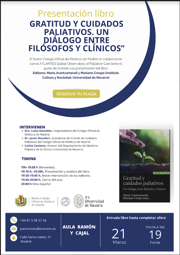 El día lunes 21 de marzo a las 19:00 h. se llevará a cabo la presentación del libro «Gratitud y cuidados paliativos. Un diálogo entre filósofos y clínicos», escrito por María Arantzamendi y Mariano Crespo, investigadores del Instituto Cultura y Sociedad (ICS) de la Universidad de Navarra.