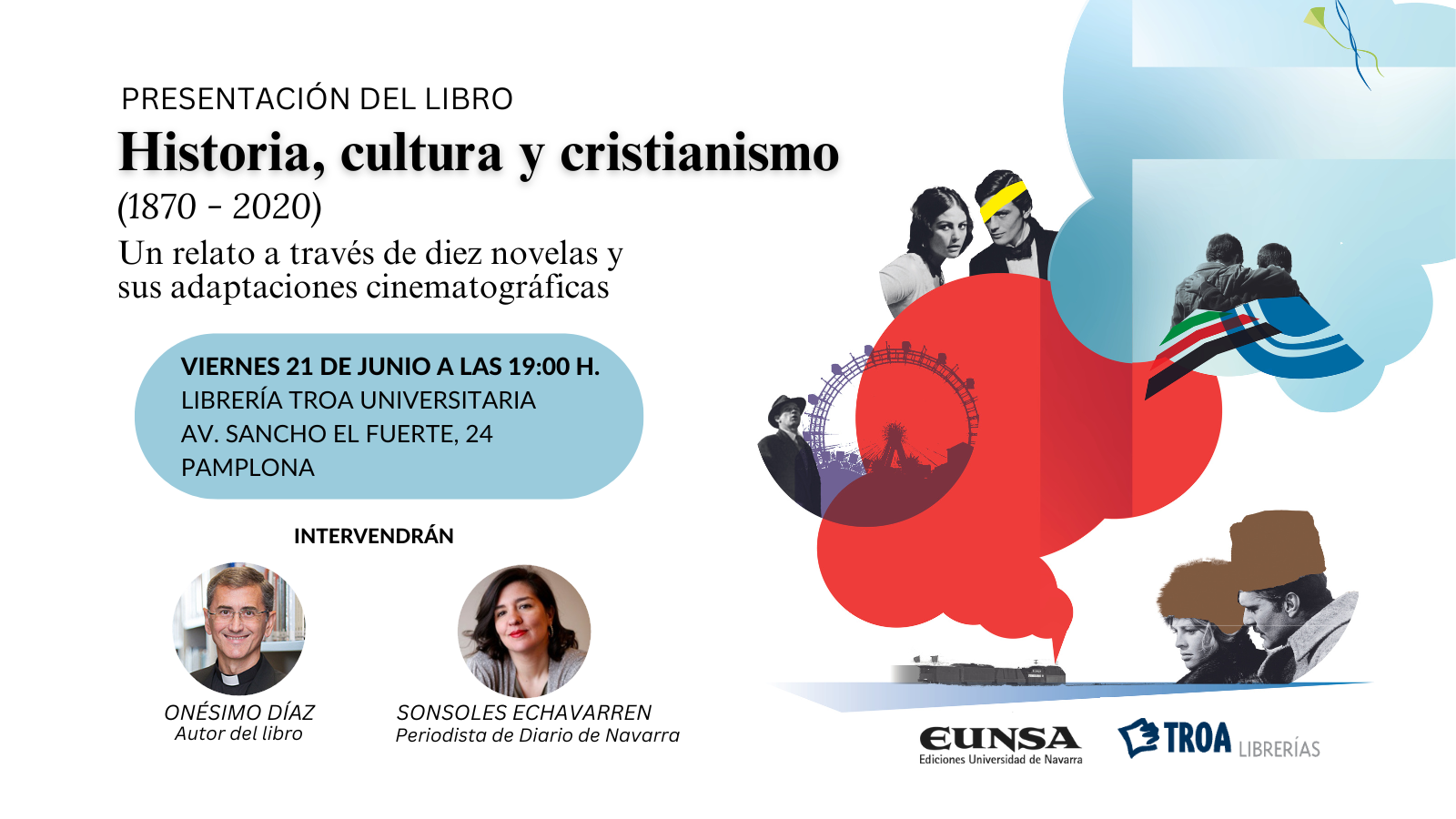 Onésimo Díaz presentará su libro "Historia, cultura y cristianismo (1870-2020). Un relato a través de diez novelas y sus adaptaciones" el próximo viernes 21 de junio a las 19:00 h. en la Librería TROA Universitaria de Pamplona. Le acompañará la periodista del Diario de Navarra, Sonsoles Echavarren. Además, se podrán adquirir ejemplares de la obra para que el autor los firme.