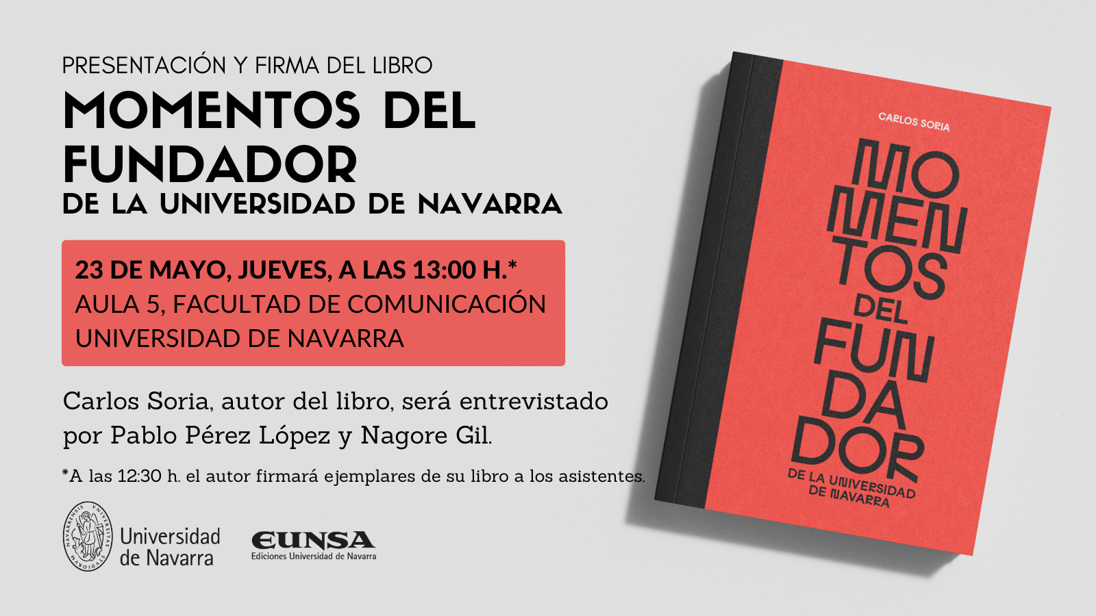 El jueves 23 de mayo de 2024 a las 13:00 h. se llevará a cabo la presentación del libro "Momentos del fundador de la Universidad de Navarra" de Carlos Soria.