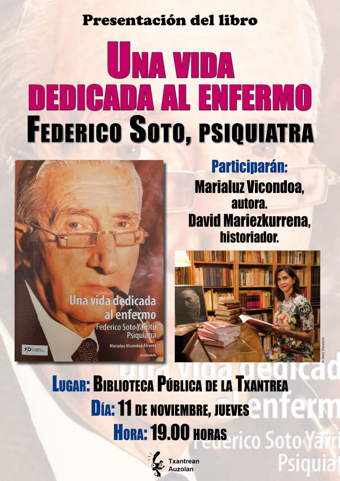 Presentación del libro Una vida dedicada al enfermo. Federico Soto Yarritu. Psiquiatra. Participarán Marialuz Vicondoa, autora del libro, y David Mariezkurrena, historiador.