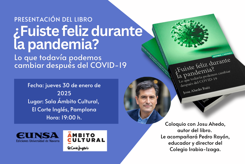 El autor de "¿Fuiste feliz durante la pandemia?", Josu Ahedo, presentará su libro en la Sala Ámbito Cultural de El Corte Inglés de Pamplona el jueves 30 de enero de 2025 a las 19:00 h. El educador y director del Colegio Irabia-Izaga, Pedro Rayón, le acompañará durante el acto.