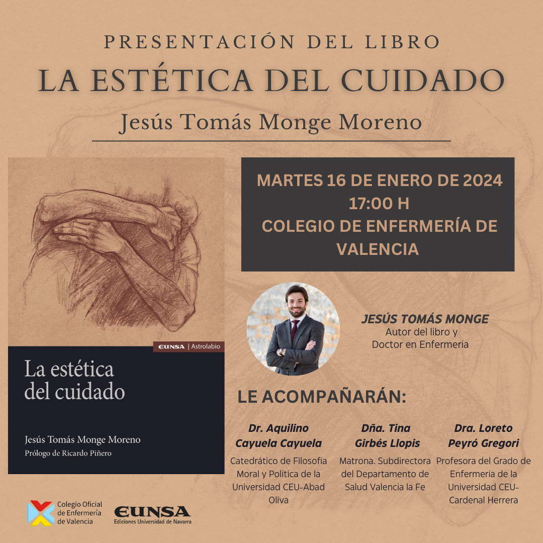 El martes, día 16 de enero, en el Colegio de Enfermería de Valencia, tendrá lugar la presentación del libro "La estética del cuidado" de Jesús Tomás Monge. El libro es una obra innovadora que plantea una nueva perspectiva sobre la importancia de la estética en el ámbito de la Enfermería y el cuidado de la salud. El autor, quien cuenta con una sólida formación académica como diplomado en Enfermería por la Universidad CEU-Cardenal Herrera, Máster en Bioética y Doctor en Enfermería por la Universidad de Navarra, explora en profundidad cómo los aspectos estéticos influyen en la calidad de los cuidados que se brindan a los pacientes, así como en la experiencia de la enfermedad tanto para los profesionales de la salud como para quienes reciben dichos cuidados.
