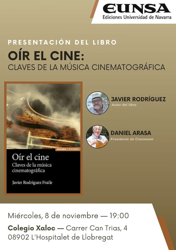 El Colegio Xaloc, de L´Hospitalet acogerá el miércoles día 8 de noviembre, a las 19 h, a Javier Rodríguez, autor de "Oír el cine. Claves de la música cinematográfica". Este evento contará también con la presencia de Daniel Arasa, periodista y escritor, presidente de Cinemanet.