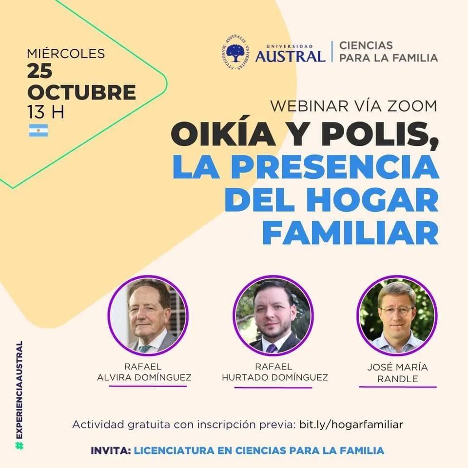 El miércoles 25 de octubre a las 13 h. Argentina (18 h. España), los autores Rafael Alvira Domínguez y Rafael Hurtado Domínguez presentarán su libro "Oikía y Polis. La familia, raíz y alma de toda sociedad". El evento se llevará a cabo vía zoom y los inscritos recibirán un enlace de acceso el día del evento.
