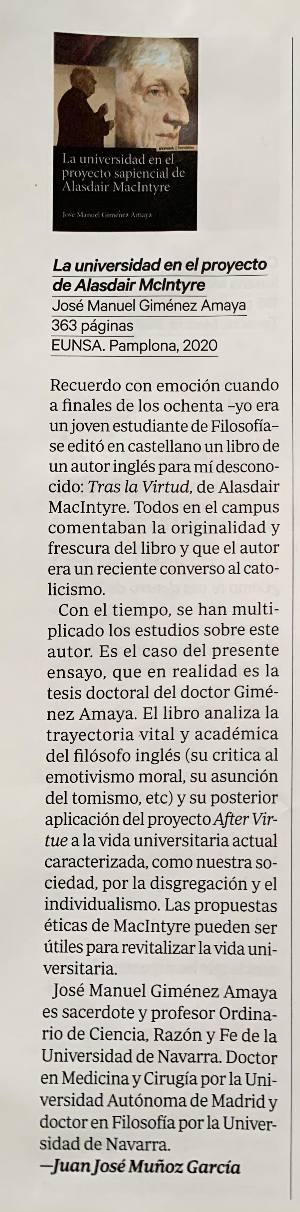 "El profesor Giménez Amaya, bien conocido por sus amplias e importantes publicaciones en el ámbito de la neurociencia y, más recientemente, por sus recientes trabajos en el diálogo fe y ciencia, ha querido abandonar momentáneamente sus intensas ocupaciones para abrirnos los ojos acerca del proyecto sapiencial y universitario del inolvidable filósofo de la virtud, el escocés, Alasdair MacIntyre, al que considera uno de sus maestros intelectuales (...) El trabajo que ahora publica magníficamente EUNSA es en esencia una de las obras más ambiciosas que se ha publicado hasta el momento acerca del trasfondo antropológico y ético del famoso pensador escocés". Por José Carlos Martín de la Hoz.