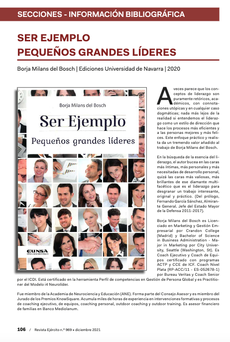 Publica Ser ejemplo. Pequeños grandes líderes (EUNSA), donde plantea un nuevo concepto de liderazgo basado en el desarrollo personal desprendido de todo ego y asentado en la humildad. “Tener un brillo especial sin ser estrellas en nada”, resume.