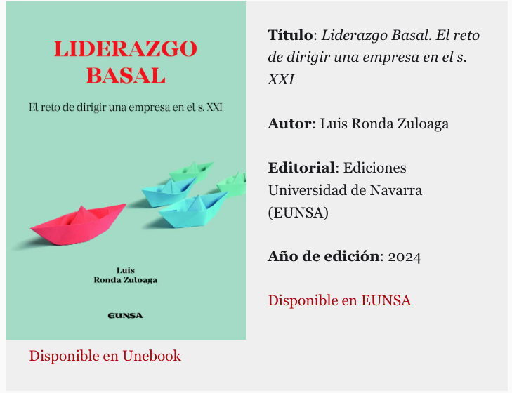 Todo ello se explica a fondo en el libro Liderazgo Basal. El reto de dirigir una empresa en el s. XXI, escrito por el ingeniero agrónomo y empresario Luis Ronda Zuloaga y editado por EUNSA, Ediciones de la Universidad de Navarra. El autor, con una extensa trayectoria en puestos directivos en empresas internacionales, es actualmente el máximo responsable de la filial en España y Portugal de una compañía de biotecnología, consejero en diferentes empresas y miembro de asociaciones profesionales.