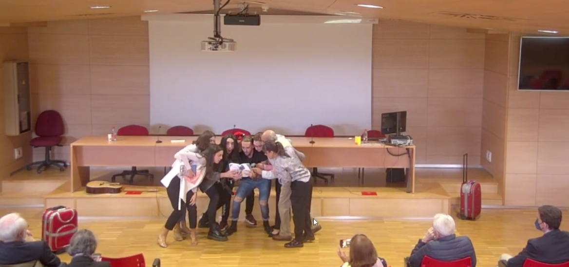 La misma María Luisa arrancó el segundo acto dando lugar a la representación de "Una Escena Flipante". Una escenificación coordinada desde el Máster Universitario en Teatro y Artes Escénicas (UCM), con la colaboración del alumnado del Máster, la Real Escuela Superior de Arte Dramático (RESAD) y la Universidad para Mayores (UCM).