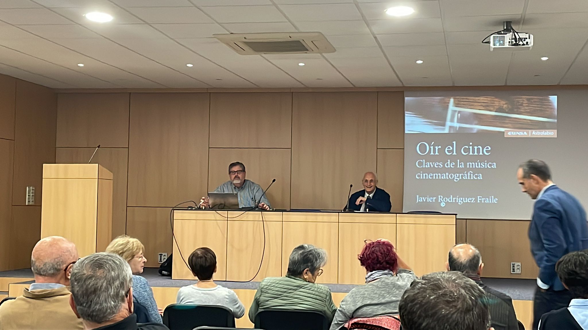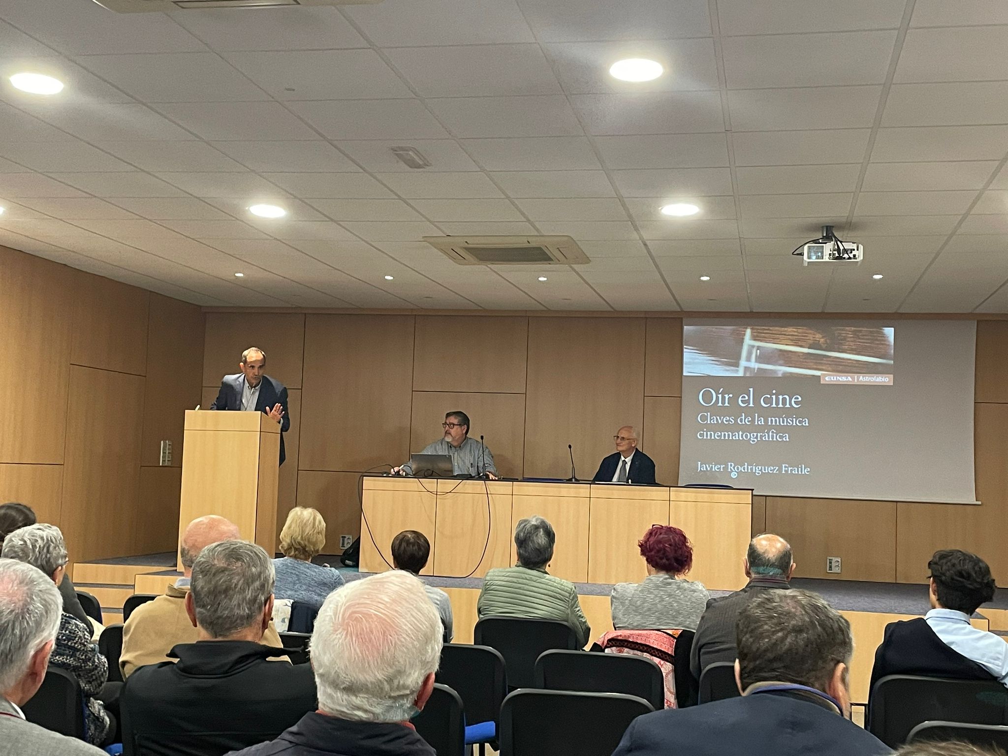 El colegio acogió a un público muy heterogéneo. Cerca de 40 personas de diferentes entornos culturales, edades, etc. El acto comenzó con la introducción de Ricardo Benito, director del colegio, quien dio paso a Daniel Arasa, periodista y escritor. Este dio algunas pistas sobre la labor del autor del libro, en Cinemanet, una asociación que promueve la difusión de valores en el cine. Tras su intervención, se dio paso al autor, quien explicó la finalidad del libro, y las características más importantes de la música de cine, apoyándose en una presentación de PowerPoint con la portada del libro siempre a la vista.