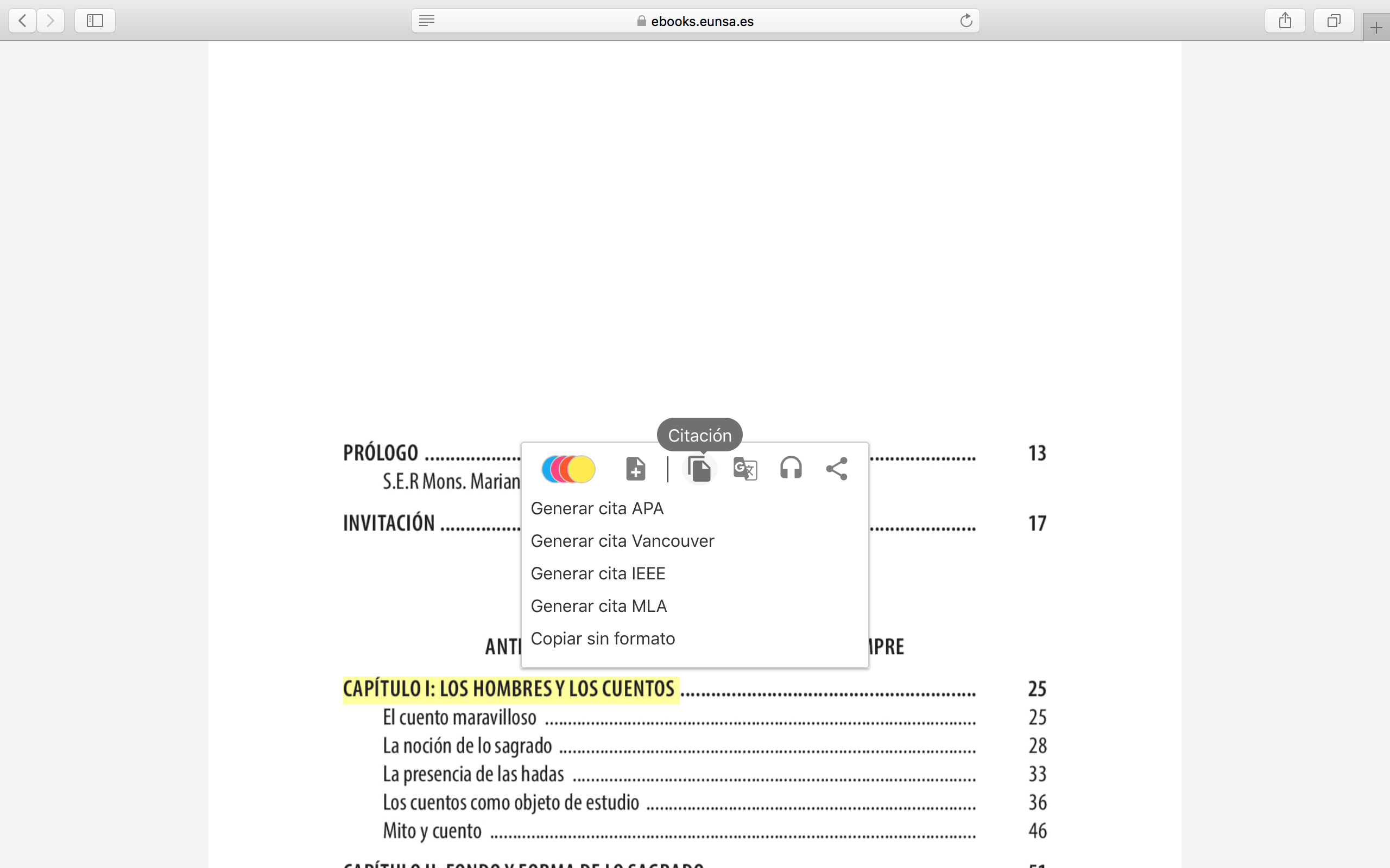 Para crear una cita, selecciona un fragmento de texto y pulsa en Citación. Los diferentes tipos de cita que es posible generar son: